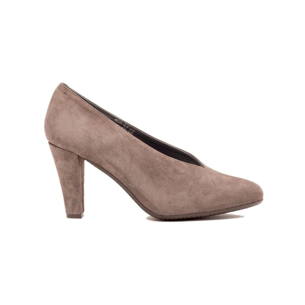 Women's kid suede pump with V-shaped top line, balanced on a cone heel. The cushioned insole and flexible rubber sole add lasting comfort.